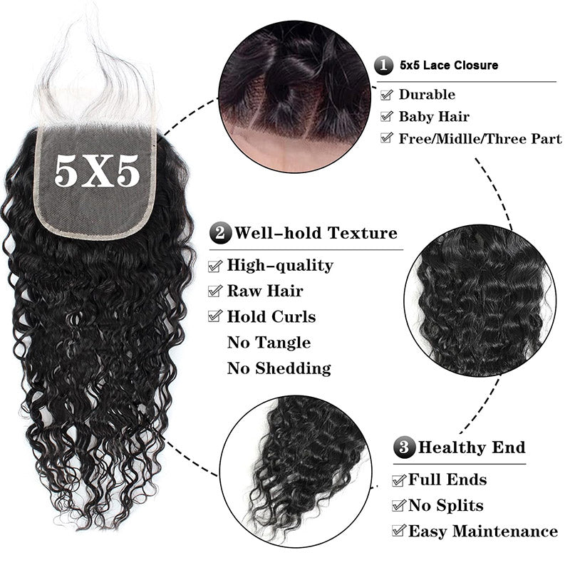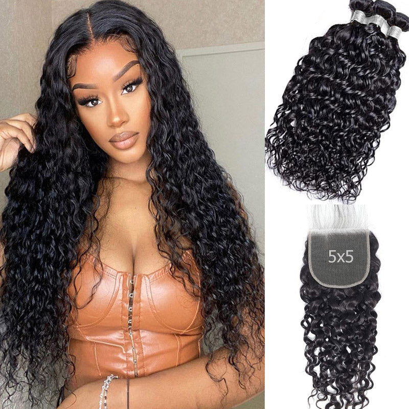 Water Wave 3 Bundles With 5x5 Transparent Lace Closure 100% Human Hair